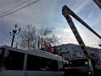 В Керчи на перекрестке улиц Еременко-Мирошника заменила флаги на новые. Перед работами установили предупреждающие дорожные знаки, - передает Керчь.ФМ.
