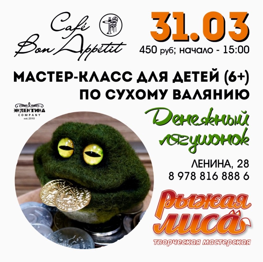 Последний мастер-класс в марте проведет творческая мастерская "Рыжая лиса". Ребятам будет предложена увлекательная техника сухого валяния. 31-го марта на занятии будем мастерить очаровательного денежного лягушонка. Амулет мастер рекомендует подкармливать монетками, и тогда он гарантировано будет приносить достаток в ваш дом.
