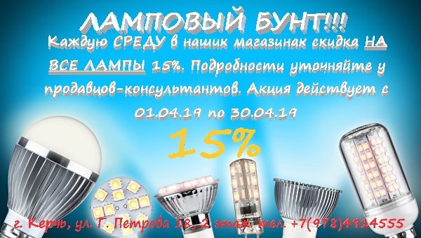 Каждую среду в наших магазинах скидки на все лампы 15 %!