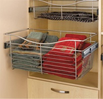 • Теперь необходимо представить где, как и что будет находиться в шкафу. Для этого можно использовать полки, выдвижные ящики, выдвижные сетчатые корзины, сетчатые полки для обуви (неподвижные или выдвижные), штанги для вешалок с одеждой, брючницы, галстучницы, держатель ремней и шарфов. Можно предусмотреть место для хранения гладильной доски и другого инвентаря.