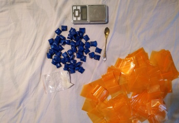 В ходе обследования жилища молодого человека, было обнаружено и изъято 55 свертков с порошкообразным веществом, упаковочные материалы, электронные весы с наслоениями вещества, а также металлическая ложка для расфасовки порошков.