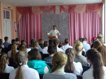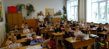 Все началось с торжественной линейки, на которой собрались обучающиеся и преподаватели, а также гости - Ветеран Великой Отечественной войны Мочеюн Валентина Васильевича, Ветеран Вооруженных Сил Советской Армии Пыркова Георгия Федоровича, представитель Совета ветеранов города Керчи Мелкумова Светлана Александровна, командир роты полка Народного ополчения города Керчи Сазонов Александр Николаевич, ветеран Афганистана, автор военной прозы Шкода Валерий Владимирович.