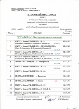 В абсолютной эстафете 4х50 метров вольным стилем смешанная, победила команда МБОУ г. Керчи РК «ШКОЛА № 2» (директор - Татьяна Сидоренко), которая выступила в следующем составе : Александр Снигирев, Дмитрий Сошенко, Илья Терещук, Виктория Дронова, на втором месте дружный коллектив МБОУ г. Керчи РК «ШКОЛА - ГИМНАЗИЯ № 2» (директор - Татьяна Бойко), третьими стала команда «ШКОЛА № 1».