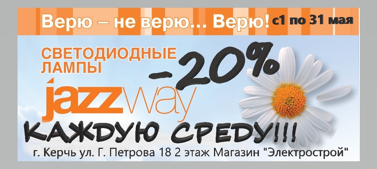 Май будет радовать вас 20% скидкой на весь ассортимент светодиодных лампочек от производителя Jazzway. Очень экономно и светло. Мы ждём Вас!!!