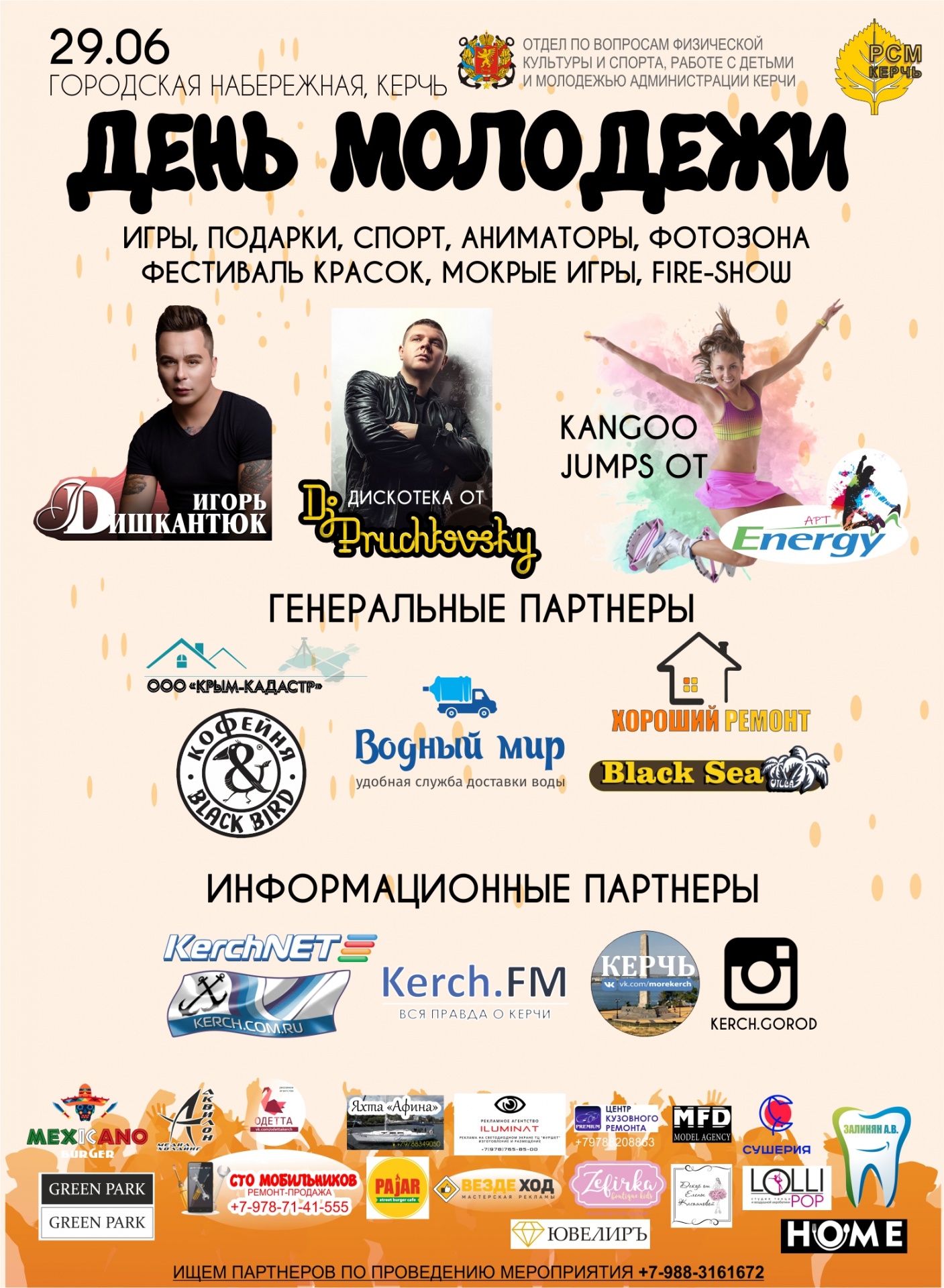 29 июня на Городской набережной Керчи пройдет празднование Дня молодежи. Мы приглашаем к сотрудничеству начинающих и опытных фотографов, музыкантов и солистов, также будем рады сотрудничеству с центрами развития ребенка, спортивными клубами и всеми, кто может провести свои мастер-классы или показать свое творчество.