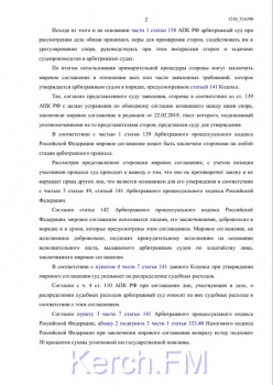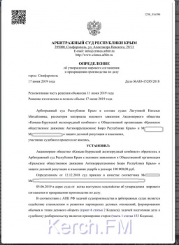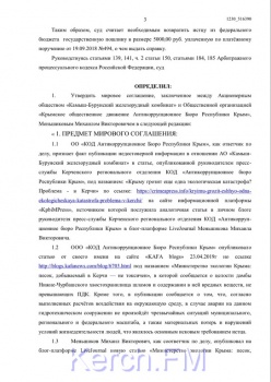 В соответствии с мировым соглашением ОО КОД "Антикоррупционное Бюро Республики Крым", как ответчик по делу, признает факт публикации недостоверной информации в отношении АО "Камыш-Бурунский железорудный комбинат" под названием:"Крыму грозит еще одна экологическая катастрофа? Проблема - в Керчи". Более того, Бюро разместило от своего имени статью под названием "Министерство экологии Крыма: песок, добываемый в Керчи - не токсичен", в которой сообщается о целости дамбы Нижне-Чурбашенского хвостохранилища шламов и содержаний в ней вредных веществ, не превышающих ПДК.