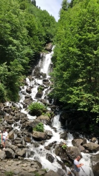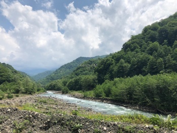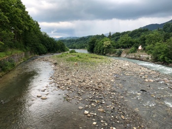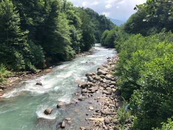 Также по дороге встречают Юпшарский каньон. Здесь остановились и полюбовались масштабом этой красоты. Там течет горная река (вдоль всей дороги), достаточно шумная и быстрая.