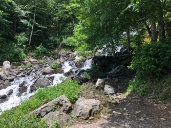По дороге расположен Молочный водопад. Он очень красивый, а молочный из-за того, что здесь много камней и при сильном потоке вода пенится и становится белой.