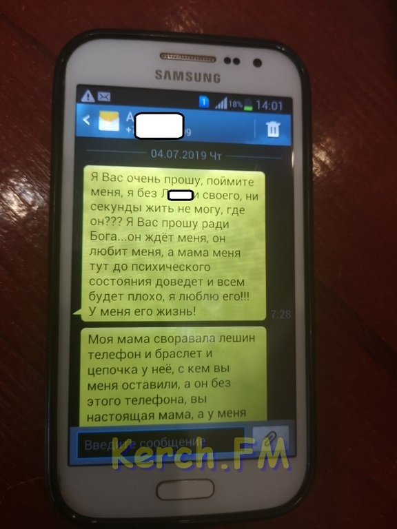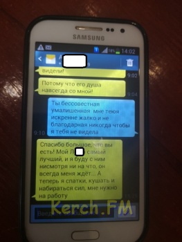 Через 2 часа на мой телефон стали приходить от нее смс о том, что она безумно любит моего сына и просит не разлучать ее с ним, при этом говорила, что своя мать доведет ее до психушки. Потом в пылу неизвестно чего написала, что я буду хоронить своего сына. Потом еще были смс о том, что она выкладывает фото своего тела в интернет и будет писать, что ее изнасиловали», - рассказала керчанка.