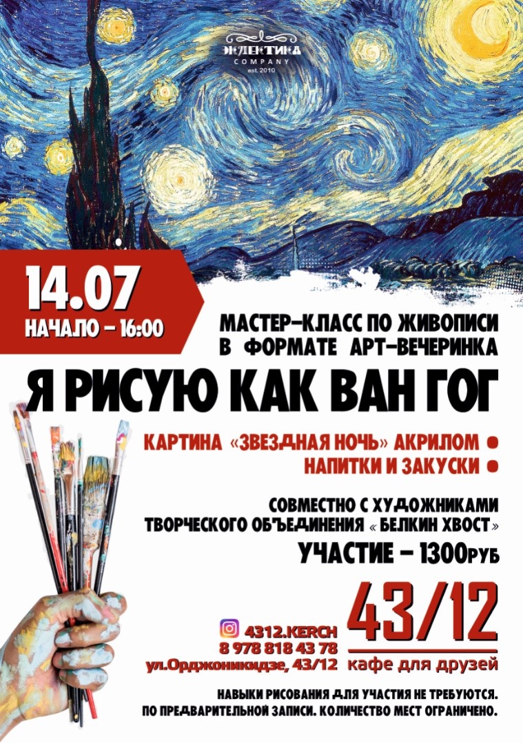14-го июля (воскресенье) кафе 43/12 вместе с художниками творческого объединения "БЕЛКИН ХВОСТ" - Ярослава Катрич и Екатерина Овсянникова - приглашает на очередную ART вечеринку всех поклонников живописи и, конечно, творчества великого художника, Ван Гога.