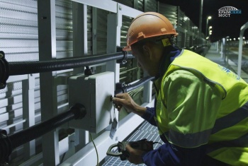 Монтаж стоек освещения со светильниками выполнен почти на 60 %. Они ставятся на пролетных строениях с обеих сторон двухпутной дороги. Световые приборы подобраны с учетом климатических особенностей региона: в Керченском проливе часто бывают штормы и туманы. Светильники - влагостойкие, с антикоррозийной защитой корпуса. Поток света - направленный, для контрастной видимости в любую погоду. Цветовая температура приближена к естественному белому свету.
