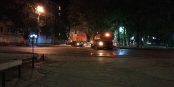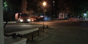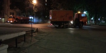 В Керчи ночью в выходные специальная техника мыла центральные дороги города. Фото в  Керчь.ФМ прислал постоянный читатель. Керчанин отметил, что один автомобиль чистит дороги, а второй сразу моет.