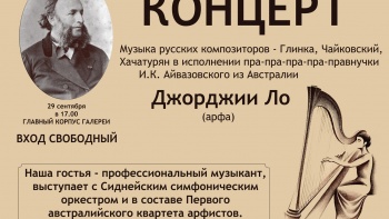 29 сентября 2019 года в 17:00 в Феодосийской картинной галереи имени И.К. Айвазовского (г.Феодосия, ул.Галерейна, 2,) состоится концерт в исполнении одного из потомков И.К. Айвазовского - его пра-пра-пра-пра-правнучки Джорджии Ло (Сидней, Австралия). Об этом сообщает Мининформ Крыма, - передает Керчь.ФМ.
