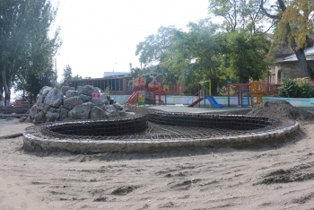 В этом парке также большая работа проводится по обустройству чаши фонтана: уложены инженерные системы водоснабжения и электроснабжения. В настоящее время выполняются работы по устройству вертикальных каркасов и установке опалубки.
