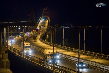 Грузопоток в направлении Крыма примерно на 4 % превысил краснодарский и составил почти 377 тысяч машин. Наибольшая месячная интенсивность движения грузовиков по мосту в обе стороны зафиксирована в июле текущего года: 73 103 автомобиля за месяц. Суточный рекорд пришелся на 26 сентября: 2 931 фура за 24 часа.