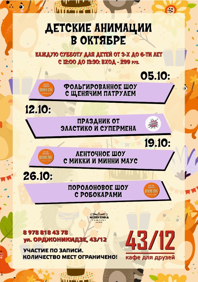 По субботам детские анимации для детей от 3-х до 6-ти лет.