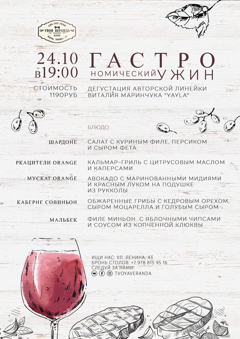 Более того, таким же цветом обведете ее и вы, когда узнаете, что 24 октября Гастрономический ужин и дегустация на Твоей Веранде!