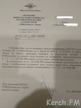 В Керчи за раздавленную на глазах хозяина собаку никто не понесет наказание. Райотдел полиции вынес постановление об отказе в возбуждении уголовного дела в виду отсутствия события преступления. Копию постановления хозяева собаки передали в Керчь.ФМ.