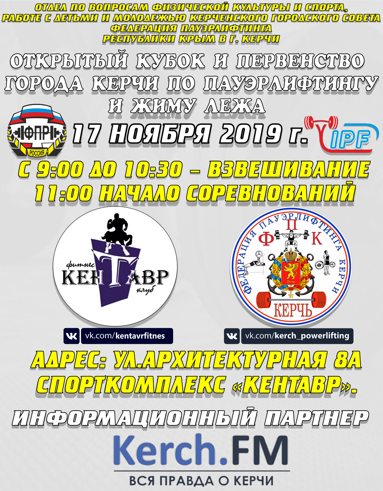 В Керчи 17 ноября пройдёт Чемпионат и первенство города по пауэрлифтингу, жиму лёжа и Второй турнир по тяжелой атлетики им. Е.А. Ольшевского. Приедет команда из города Феодосии. Об этом Керчь.ФМ сообщили организаторы мероприятия.