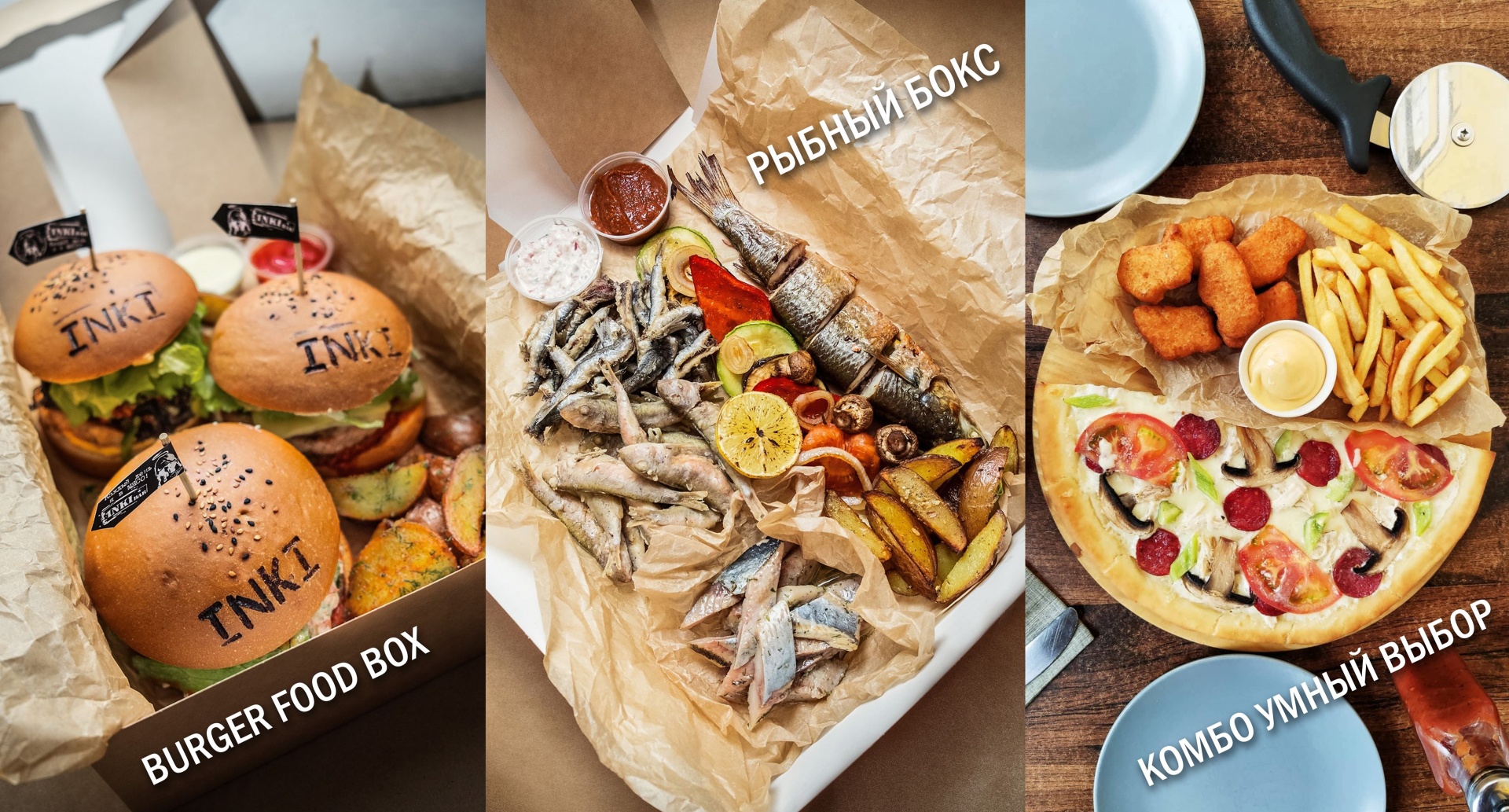 Burger food box. Грузинский бургер: сочная пряная котлета из рубленой баранины, с красным острым соусом, сальсой из томатов и ароматной зелени со сливочным соусом; Русский бургер: котлета из рубленой свинины с нежным сыром Моцарелла, красный пикантный и сливочный соусы, шампиньоны, маринованный огурец, спелые томаты и листья салата айсберг; Греческий бургер: сочная котлета из рубленой свинины, сливочный соус, спелые томаты, свежий огурец, листья салата айсберг и сладкий крымский лук, нежный сыр фета и оливки.