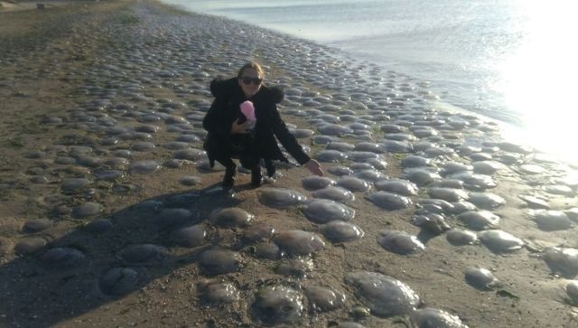 Прибрежная полоса усеяна крупными медузами. Очевидцы связывают происходящие со штормом.