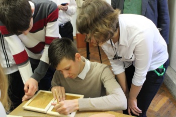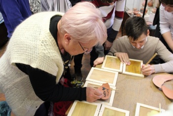 В зале посетителей ожидал небольшой мастер-класс — на столе были разложены восковые таблички, фрагменты керамики, тушь и стили, для написания. Все желающие смогли почувствовать себя настоящим жителем Боспорского царства и понять как это — писать стилем на восковой табличке или тушью на керамике.