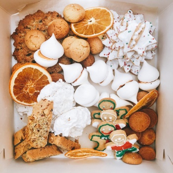 - подарочный набор угощений (815) - 680 р (в составе пряничная ёлочка, овсяное печенье, бискотти с миндалем, печенье фундучное, печенье песочное с цедрой, безе с вареной сгущенкой, пряничные человечки и апельсиновые чипсы).