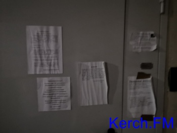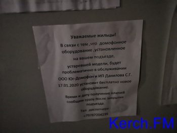 На дверях обоих подъездов висят объявления о необходимости заключить договор с управляющей компанией «Жилсервис Керчь». Также там висит объявление о том, что есть какие-то неисправности с домофонами и уже сразу предлагают обратиться к частнику.