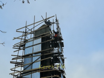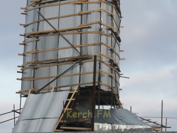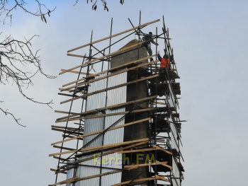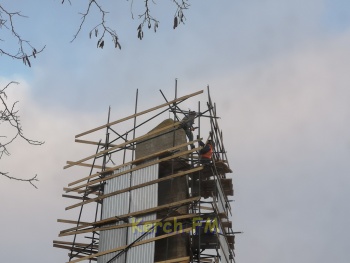 На Митридате продолжаются реставрационные работы Обелиска Славы. У рабочих, которые находились  на высоте восьмиэтажного дома, не было  страховки. Об этом в редакцию Керчь.ФМ написали постоянные читатели.