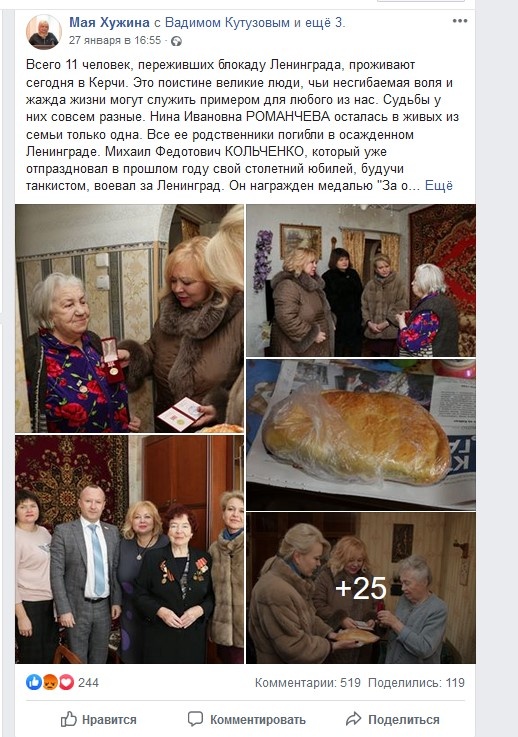 В Керчи 27 января прошли мероприятия, посвященные освобождению Ленинграда. В этот же день председатель горсовета Керчи Мая Хужина вместе с другими чиновницами Ларисой Щербулой и Дианой Ушаковой, а также депутатом госсовета Крыма Ириной Черненко и другими отправились поздравлять 11 блокадников, которые сейчас живут в Керчи.