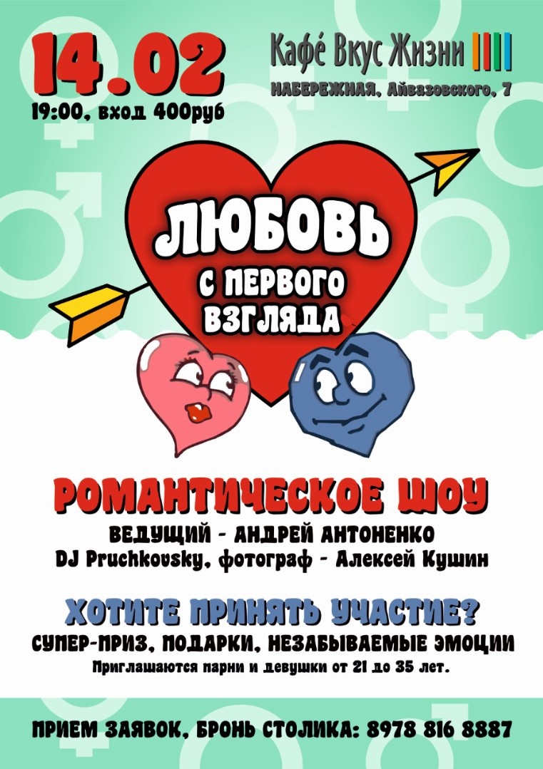 Безусловно, каждый из Вас помнит самое популярное телешоу конца 90-ых. Мы все с нетерпением ждали выхода программы и искреннее радовались за участников. 14-го февраля команда кафе "Вкус Жизни" воссоздаст "Любовь с первого взгляда"! Мы приглашаем Вас стать участниками романтического шоу!