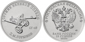 — монета «Конструктор оружия П.М. Горюнов» расположено рельефное изображение станкового пулемета СГ-43, справа — надпись: «СГ-43»; по окружности имеются надписи, вверху: «ОРУЖИЕ ВЕЛИКОЙ ПОБЕДЫ», внизу: «П.М. ГОРЮНОВ»;