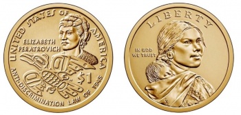 1-долларовая монета серии «Американский индейский доллар» на 2020 год посвящена Елизавете Ператрович и Закону о борьбе с дискриминацией на Аляске.