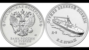— монета «Конструктор оружия Л.Л. Ермаш» расположено рельефное изображение торпедного катера типа «Д-3», слева — надпись: «Д-3»; по окружности имеются надписи, вверху: «ОРУЖИЕ ВЕЛИКОЙ ПОБЕДЫ», внизу: «Л.Л. ЕРМАШ»;