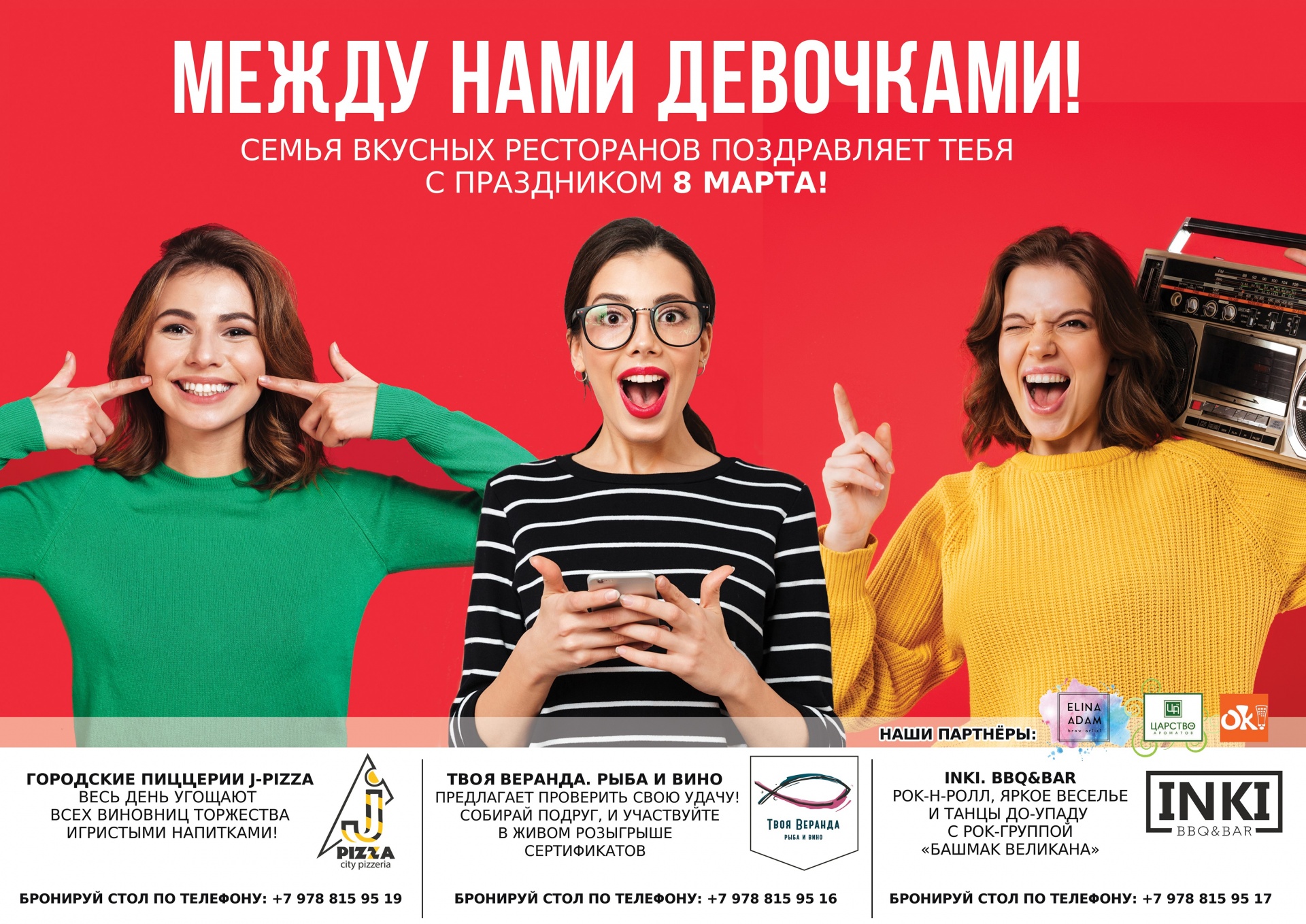Семья вкусных ресторанов поздравляет Тебя с праздником 8 марта!!! Давай смотреть, как ты будешь отдыхать в этот день: