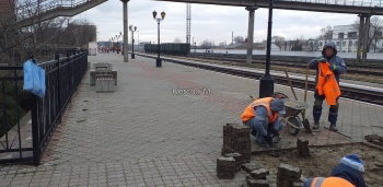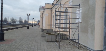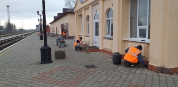 Так, территорию у вокзала убирают коммунальщики с помощью техники. Внутри идут ремонтные работы: здесь делают фасад, перекладывают плитку, проверяют освещение.