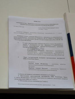 Тема мероприятия: «Правовые и технологические аспекты диверсификации оборонно-промышленного комплекса Российской Федерации». В обсуждении принимает участие председатель подкомитета по международному военно-политическому сотрудничеству Комитета СФ по обороне и безопасности, представитель от исполнительного органа государственной власти Республики Крым в СФ ФС РФ Ольга Ковитиди, заместитель министра промышленной политики Республики Крым Елена Элекчян, директора промышленных заводов Республики Крым и Севастополя и другие.