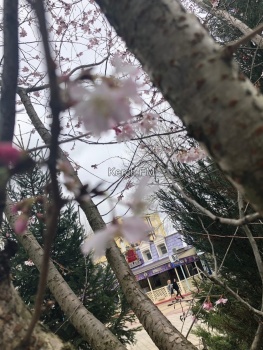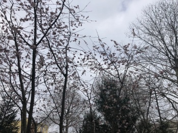 Полностью распустившееся дерево еще без листьев с нежно-розовыми цветками встречает прохожих на ул. Ленина.