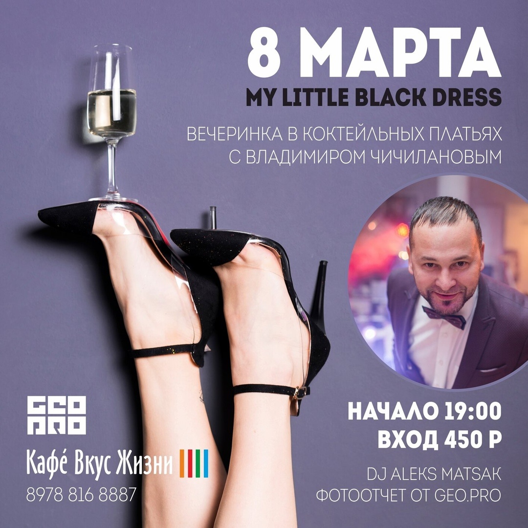 Милые, прекрасные, лучезарные музы! Приглашаем Вас и Ваших близких 8-го марта на вечеринку MY LITTLE BLACK DRESS с Владимиром Чичилановым. Развлекательная программа, подарки от партнеров, фотоотчет от GEO.PRO. За пультом — DJ Aleks Matsak. Дресс-код вечера — коктейльные платья.