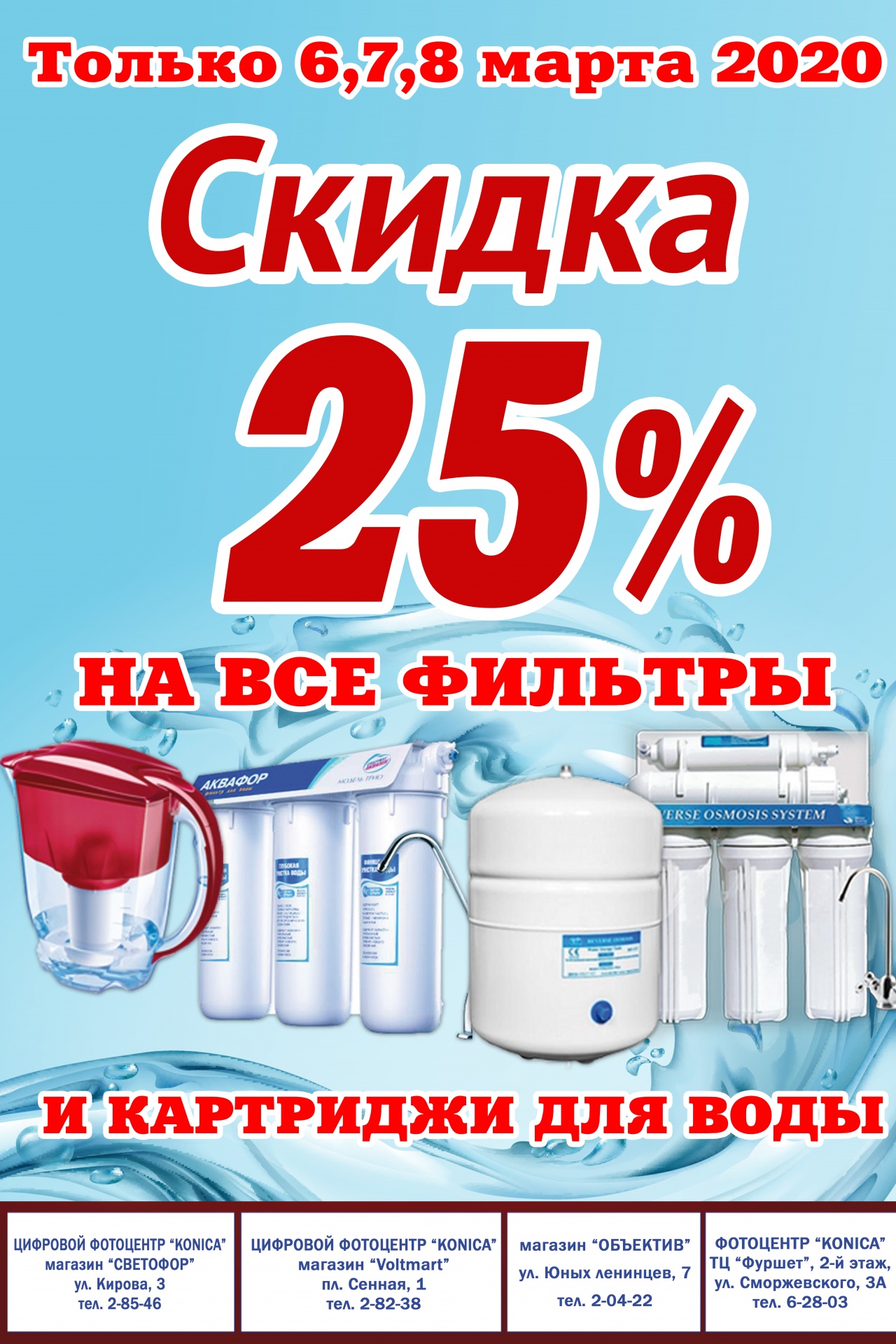 Только три дня 6, 7, 8 марта 2020г. скидки 25% на ВСЕ картриджи и фильтры для воды в магазинах Коники.