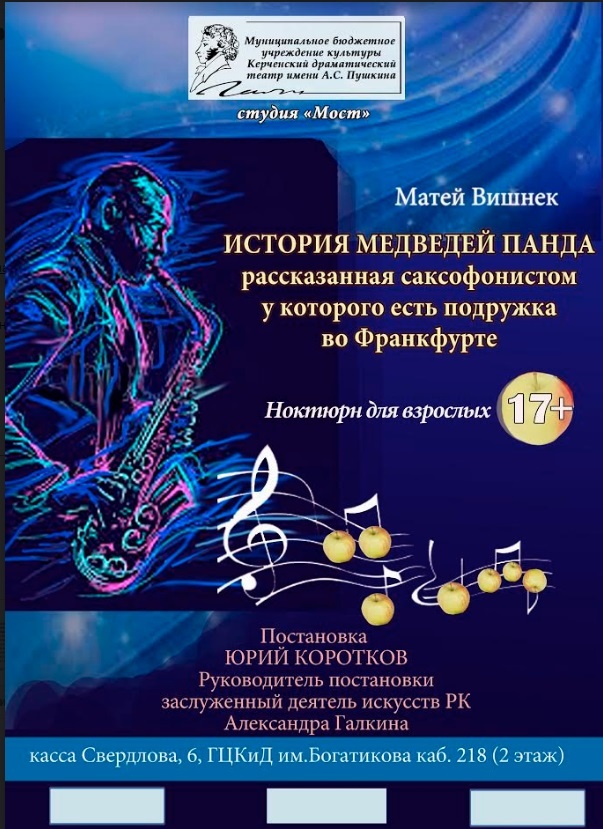 Мы приглашаем Вас на премьерный показ пьесы М. Вишняка «Замечательная история медведей панда, рассказанная саксофонистом, у которого есть подружка во Франкфурте». Мистическая трагедия — достаточно неожиданный выбор пьесы для первого спектакля в истории театра - обычно принято начинать с классики... Просто мы хотим, чтобы Вы - наши уважаемые зрители, знали, что наш театр всегда готов удивить вас!