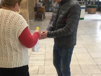 При входе в горсовет людям обрабатывают руки, дежурный и охрана - в масках