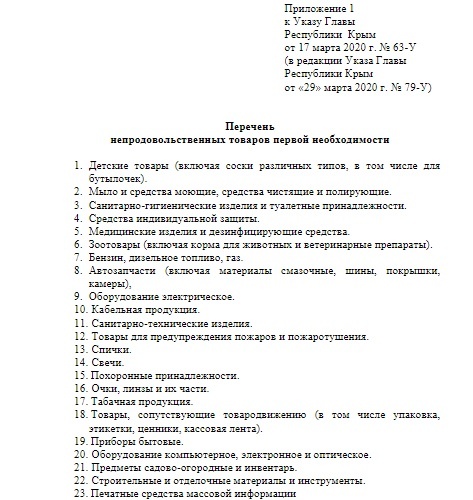 В  Указ Главы Республики Крым от 17 марта 2020 года № 63-У внесли еще ряд изменений 29 марта. Как и обещали, закрыли деятельность «наливаек» и ломбардов, а также расширили список непродовльственных товаров первой необходимости.