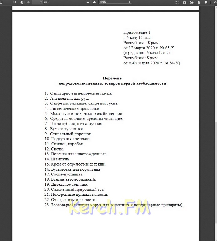 Сегодняшние изменения к Указу Главы Крыма дополняют Распоряжение Правительства РФ. Так, дополнительно товарами первой необходимости в Крыму являются похоронные принадлежности, средства моющие, средства чистящие, шампуни для всех, а не только детские, очки, линзы и их части.