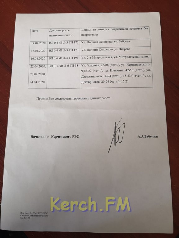 Керченский РЭС возобновляет проведение плановых ремонтных работ с отключениями электричества. Так, в апреле будут заменены аварийные опоры на улицах Полины Осипенко, Забрева, 2-ой Митридатской, Митридатском тупике, Чкалова, Чернышевского, Пушкина, Дзержинского, Декабристов. Об этом редакции Керчь.ФМ сообщил начальник керченского РЭС Александр Забелин.