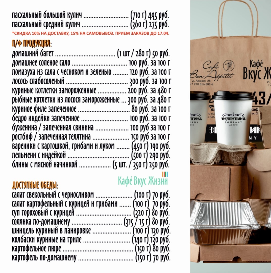 Кафе «Вкус Жизни» предлагает также заказать на доставку блюда и полуфабрикаты по доступным ценам помимо блюд из основного меню. Никаких консервантов и красителей! Хотите разнообразить свой рацион и минимизировать выходы за продуктами? Команда кафе «Вкус Жизни» готова Вам в этом помочь. Все будет ВКУСно!