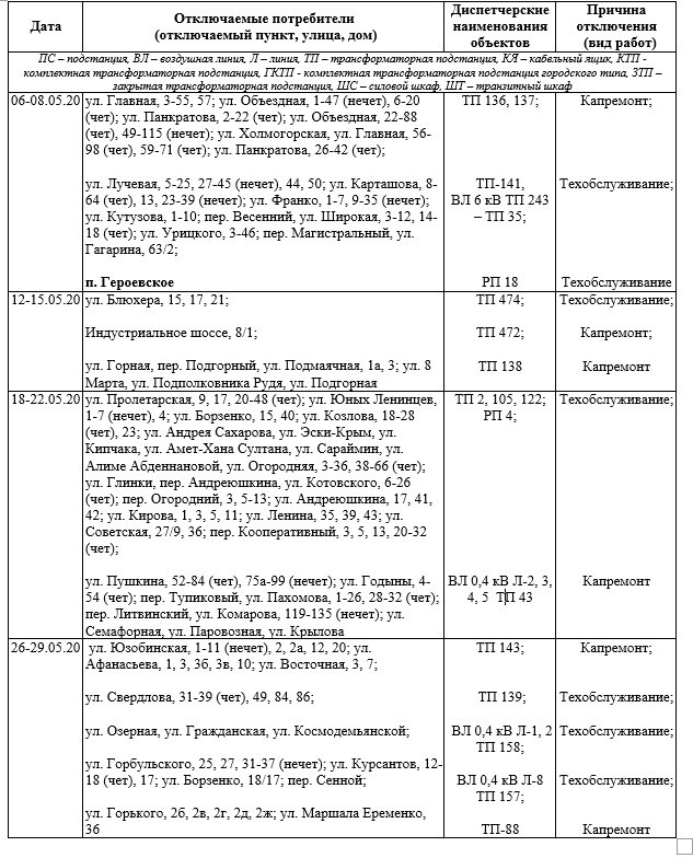 В связи с плановым ремонтом электрооборудования в мае в период с 8 до 17 часов будут происходить отключения линий электропередачи согласно нижеприведенному графику. Об этом сообщает ГУП РК «Крымэнерго», - передает Керчь.ФМ.