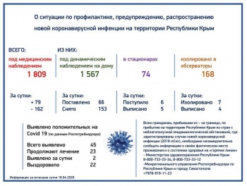 По данным ежедневного мониторинга по сложившейся ситуации с новой коронавирусной инфекцией в Республике Крым, под медицинским наблюдением находятся 1809 человек. Из них под динамическим наблюдением на дому находится 1567 человек, в стационарах находятся 74 человека, изолировано в обсерваторы - 168 человек. Готов к развертыванию второй обсерватор в г. Евпатория на 150 мест. Об этом сообщает пресс-служба Правительства Крыма, - передает Керчь.ФМ.