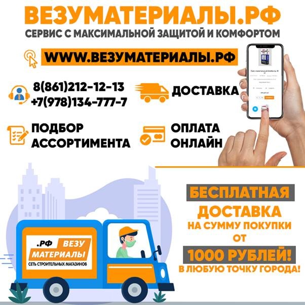 Заказывай на www.везуматериалы.рф, оплачивай онлайн любым удобным способом (карта МИР, Visa, Mastercard, QIWI и др., а также БЕЗНАЛИЧНЫЙ РАСЧЕТ для ЮРИДИЧЕСКИХ ЛИЦ).