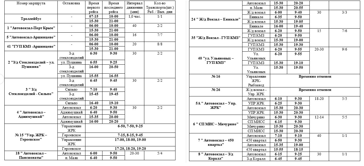 В Керчи обновили расписание движение общественного транспорта по городским маршрутам с 1 мая. Некоторый транспорт в вечерне время начнет ходить не с 17, а с 15.30. Об этом сообщает пресс-служба администрации Керчи, - передает Керчь.ФМ.